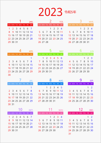「年間カレンダー カラフル 横向き」の用紙縦向きタイプです。祝日、西暦、元号入りです。日曜始まり、月曜始まり、1月始まり、4月始まりのカレンダーがあります。