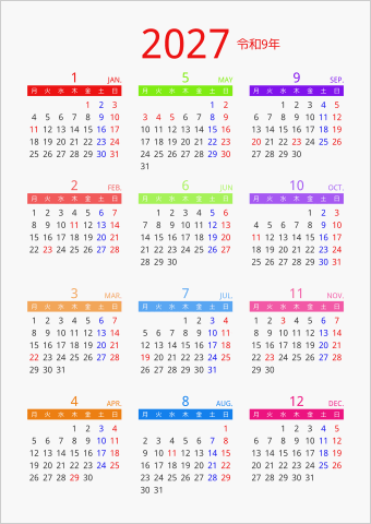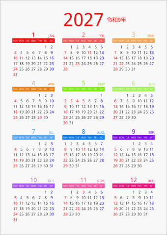 「年間カレンダー カラフル 横向き」の用紙縦向きタイプです。祝日、西暦、元号入りです。日曜始まり、月曜始まり、1月始まり、4月始まりのカレンダーがあります。