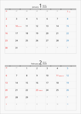 日曜始まりと月曜始まりのカレンダーがあります。祝日、西暦、元号入りで、六曜入りカレンダーもあります。