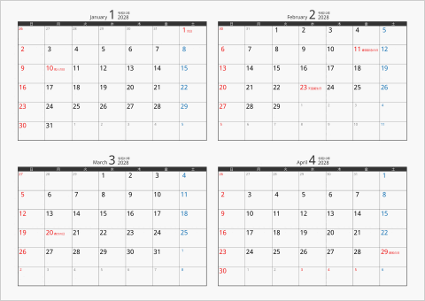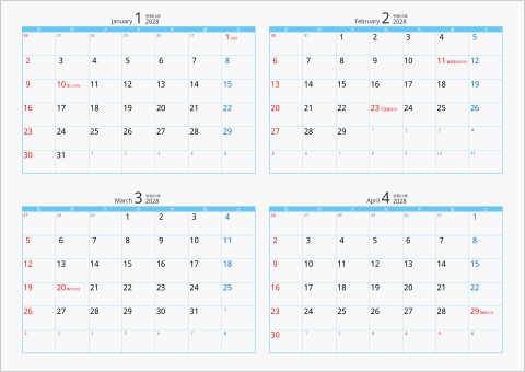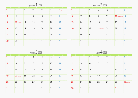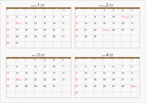 3. 2028年 4ヶ月カレンダー