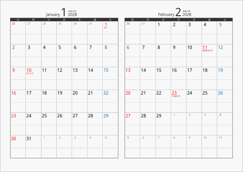 「2ヶ月カレンダー カラー枠 横向き」と同じデザインで、枠の内に、区切り線が入ったタイプです。