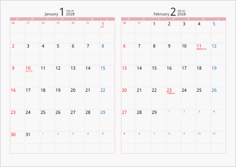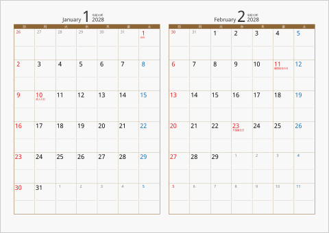 日曜始まりと月曜始まりのカレンダーがあります。祝日、西暦、元号入りで、六曜入りカレンダーもあります。
